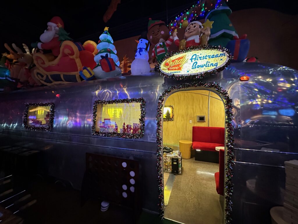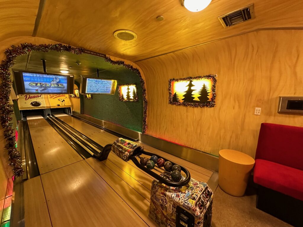 Entertainment includes a pool table, foosball, and bowling inside the Airstream.