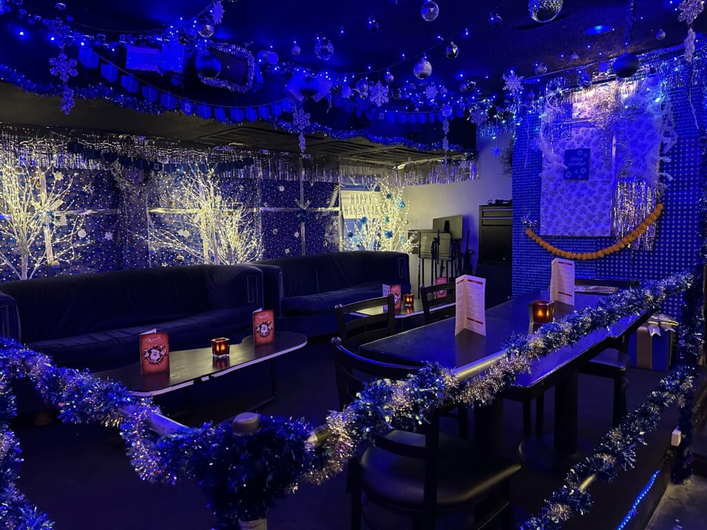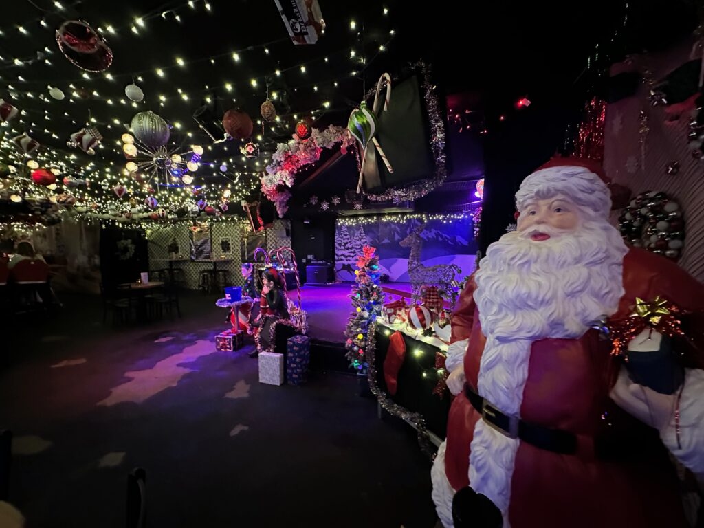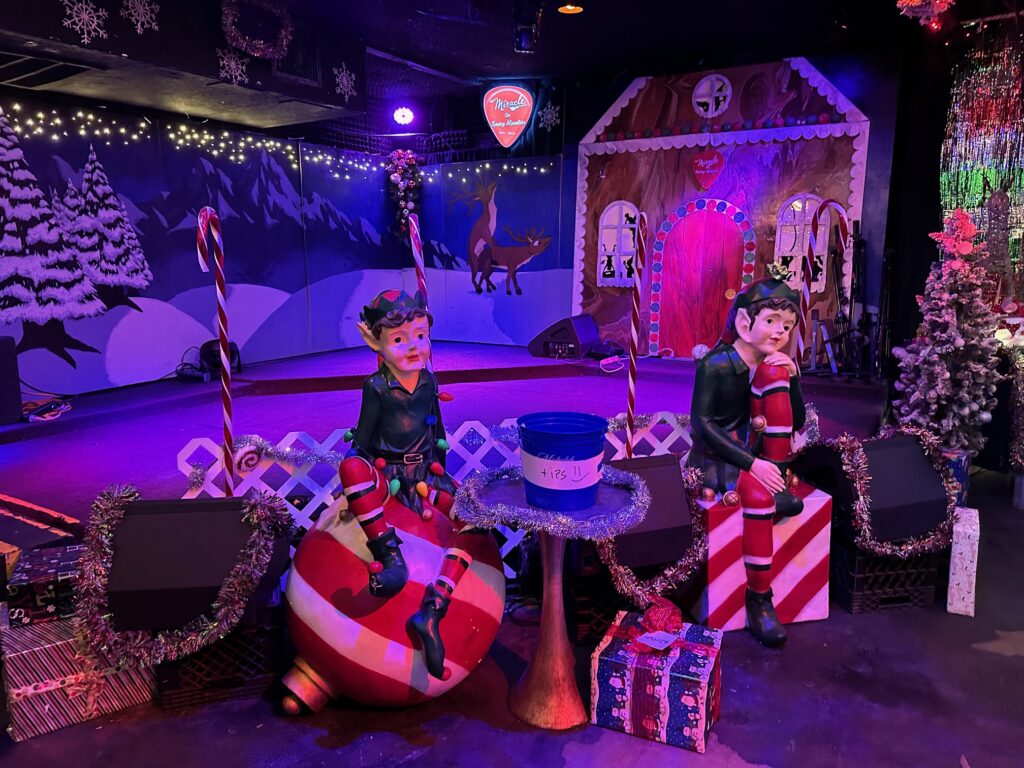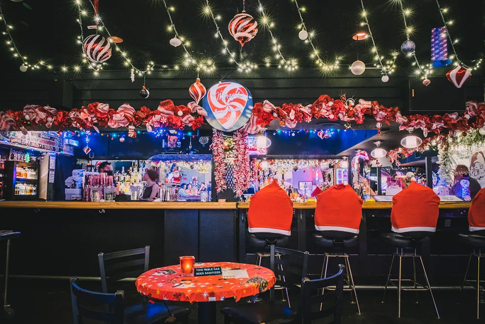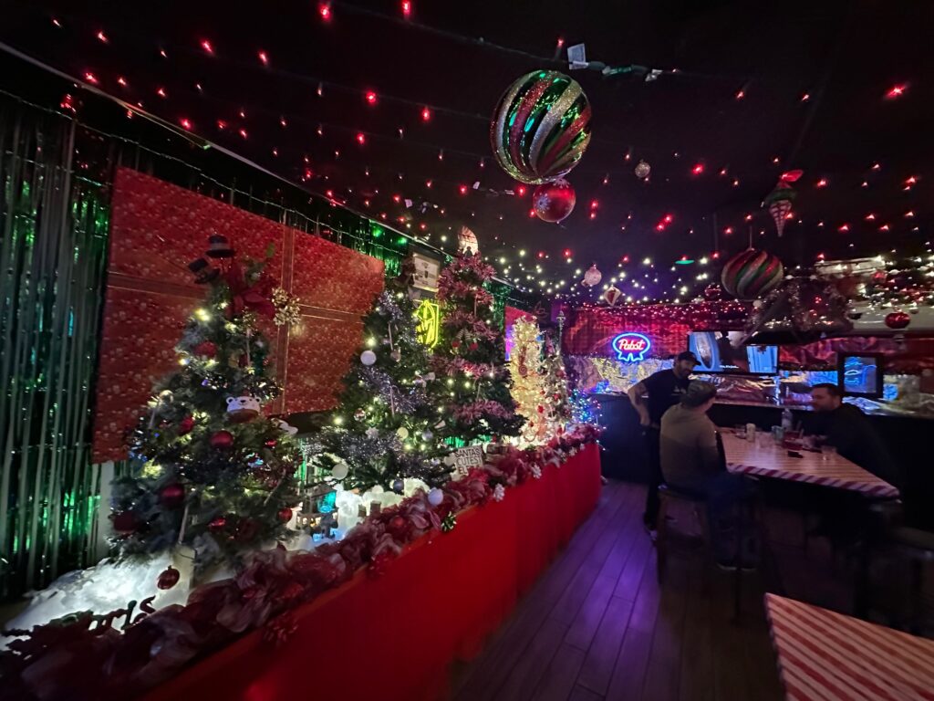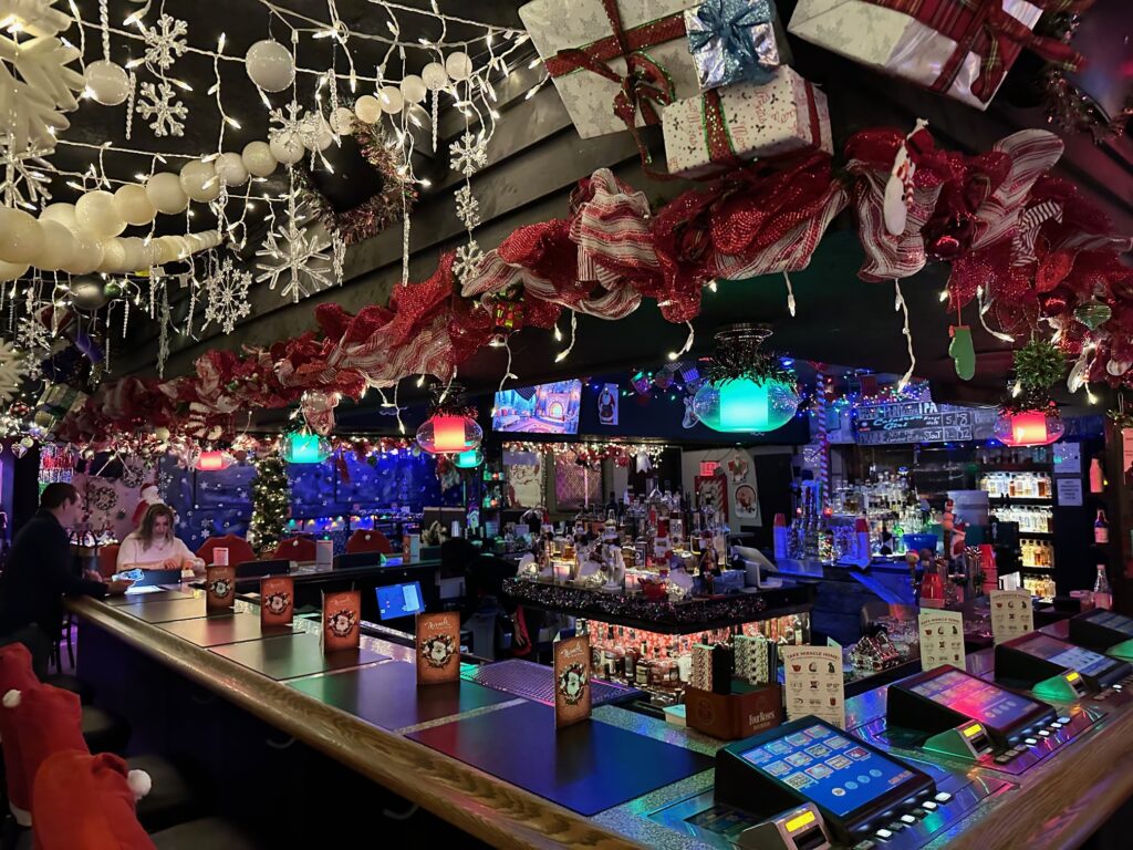 Jamison and his crew go Christmas-crazy with decor, hanging lights, tinsel, character cut-outs, ornaments and almost anything else you can think of all around (and all over) the bar. Hanukkah is also represented with a blue and silver Kosher Korner with a great view of the stage and more seating.