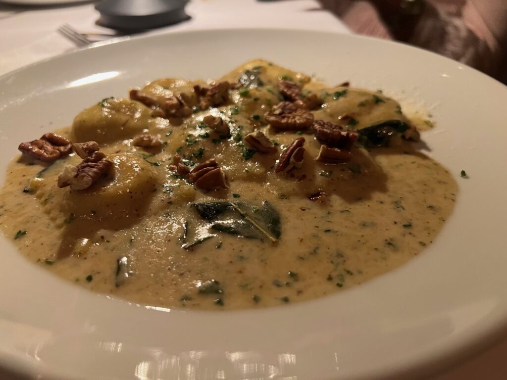 House-made pasta includes Butternut Squash Ravioli with mascarpone and brown butter cream sauce, shrimp fra diavolo with tiger shrimp and white wine, and Bolognese with pancetta and tagliatelle.