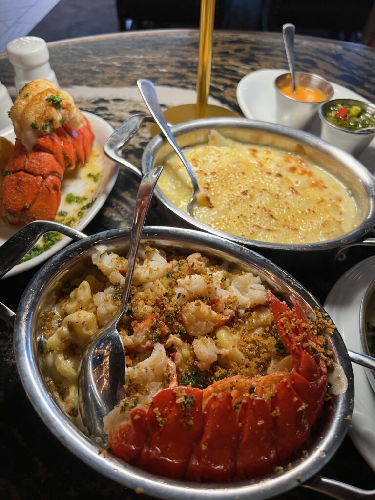 There are even more meaty options, with shareable cuts of Dry-Aged Tomahawk Ribeye, Wagyu NY Strip, and Wagyu Rib-eye. Other shareable options include the sides, large enough for two: Lobster Mac N Cheese, Potatoes Au Gratin, Burrata & Roasted Tomatoes, Crispy Yucca Fries, and Chiles Toreados (blistered jalapenos and onions).