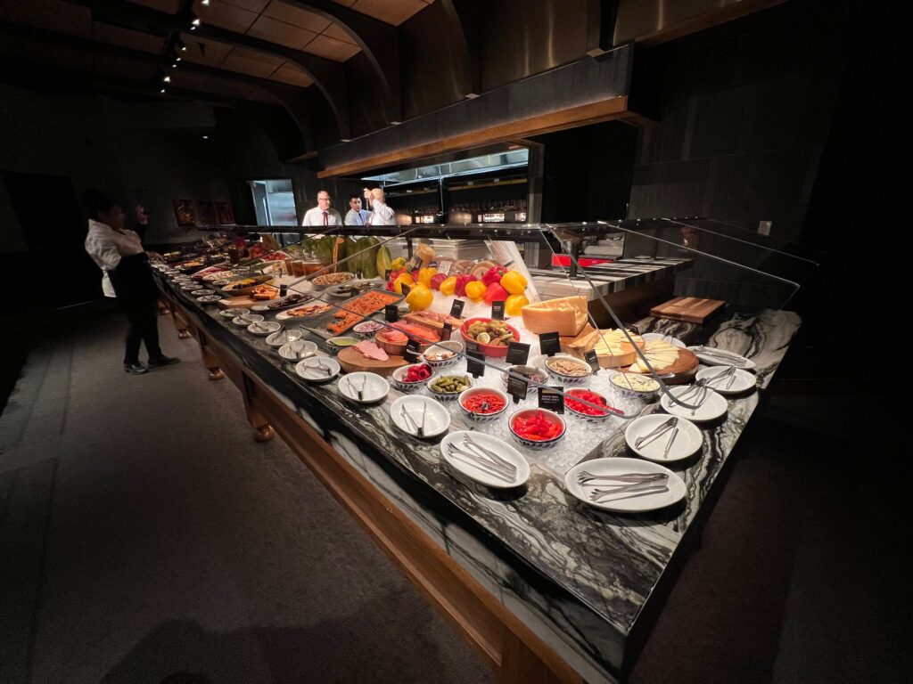 As for the décor, the dining room features warm brown tones, with mahogany-hued banquettes, two-toned wood tables, and an attractive long mirrored bar displaying an ample selection of high-end spirits. The two-level space accommodates 165 guests on the first level and, on the upper level, an additional 350 seats in a dining room, lounge, and three private dining rooms. There’s also an open churrasco grill on both levels, giving guests a 360-degree view of the gaucho chefs demonstrating the culinary art as they butcher, prepare, and grill high-quality cuts of protein over an open flame. Interestingly, these same gauchos are the ones bringing the various meats to carve at your table.