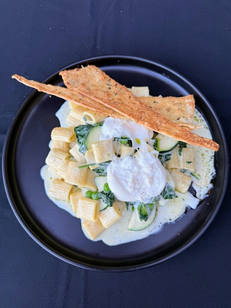 - Burrata Cheese & Spring Greens Rigatoni with lemon-cream sauce, zucchini, baby spinach, Romano cheese, and spring peas topped with burrata and basil oil