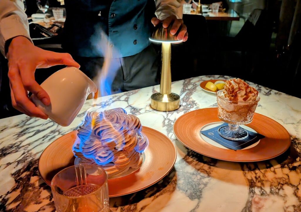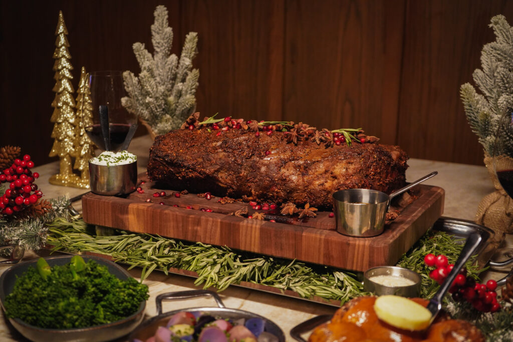 During this holiday season, some notable offerings are worth taking advantage of. Available on Christmas Eve and Christmas Day from 5 to 10 p.m. are Winter Beet Salad with Salanova lettuce, citrus, crispy goat cheese, and truffle vinaigrette; Potato Leek Soup topped with crispy bacon, chives, and a delicate puff pastry topping; Holiday Prime Rib Roast served alongside a savory cornbread casserole, rosemary au jus, and creamy horseradish; and a classic Christmas Croquembouche—a tower of pâte à choux filled with pastry cream drizzled in caramel atop almond nougatine.