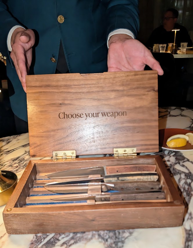The menu, created by Ontiveros, features a variety of cuts of Japanese A-5, Australian and domestic wagyu, and wet- and dry-aged American steaks from renowned artisan producers such as Allen Brothers, Creekstone Farm, and Snake River Farms. Before your steak is delivered, your server will present a classy wood box emblazoned with “Choose Your Weapon.” It contains five custom-made steak knives with various handles for you to select from. Add-ons are Alaskan King Crab, Lobster Tail, Black Truffle Butter, Roasted Bone Marrow, and Hudson Valley Seared Foie Gras; and sauces include house-made Cs-steak sauce, red wine Bordelaise, peppercorn, bearnaise, hollandaise and Point Reyes blue cheese.
