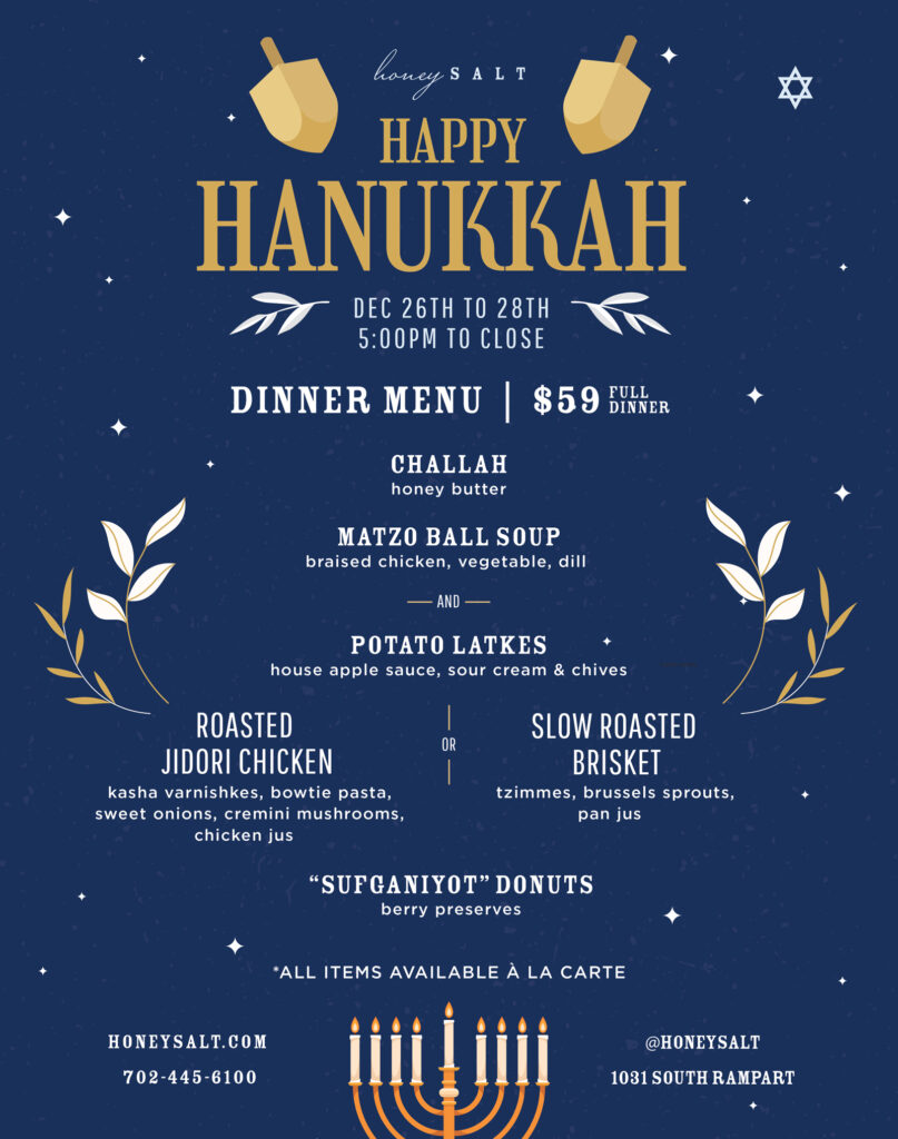 Honey Salt will offer a full Hanukkah dinner from December 26-28, available from 5 p.m. to closing.