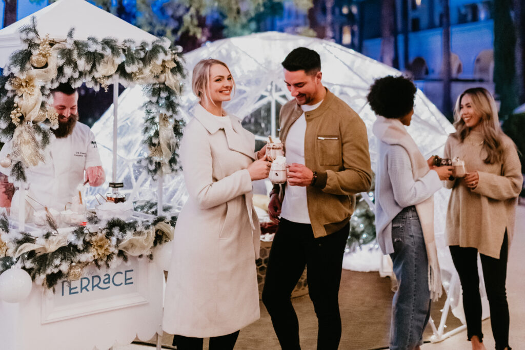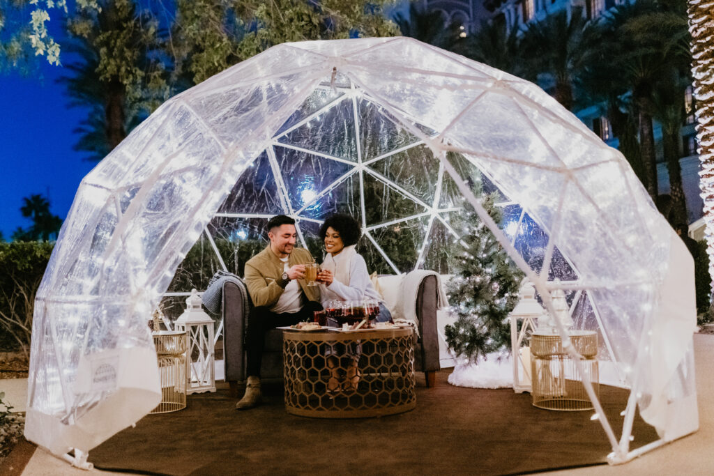 Located at the resort’s Lobby Terrace, the winter experience features cozy private igloos and fire pits, twinkling lights, cheerful music, merry photo opportunities, a hot chocolate cart, winter-inspired libations, light bites, and sweet treats.