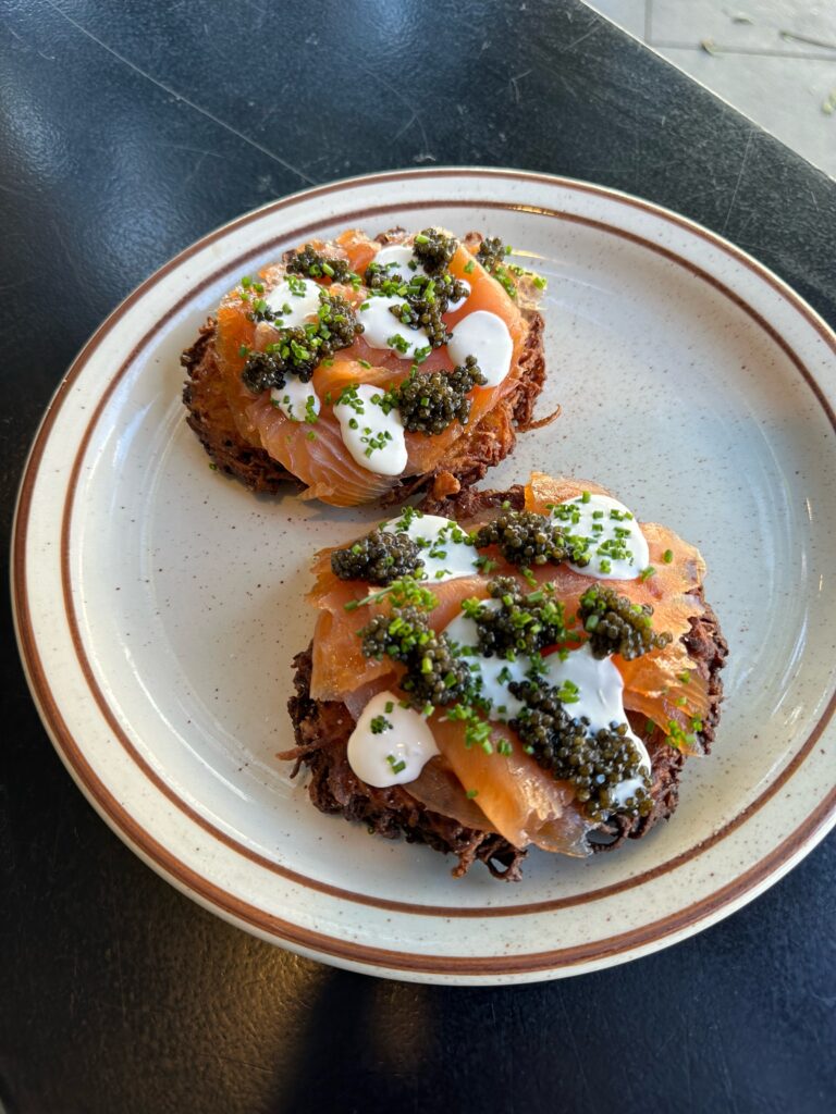- Caviar made with potato rosti, almond crème fraîche, chive, and kelp caviar