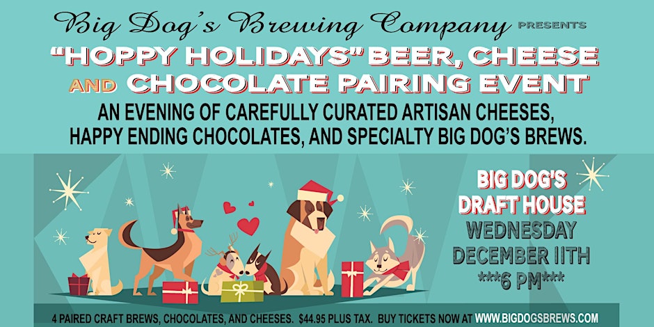 Big Dog’s Brewing Company and Happy Ending Chocolates are partnering to present the Hoppy Holidays Beer, Chocolate, and Cheese Pairing. Held at the Draft House/Big Dog’s Brewing from 6-8 p.m., the event will include four Big Dog’s specialty beers from the past year, four Happy Ending Chocolates, four artisanal cheeses, and special presentations from Executive Chef Sergio Meza and Big Dog’s Head Brewer Dave Pascual.
