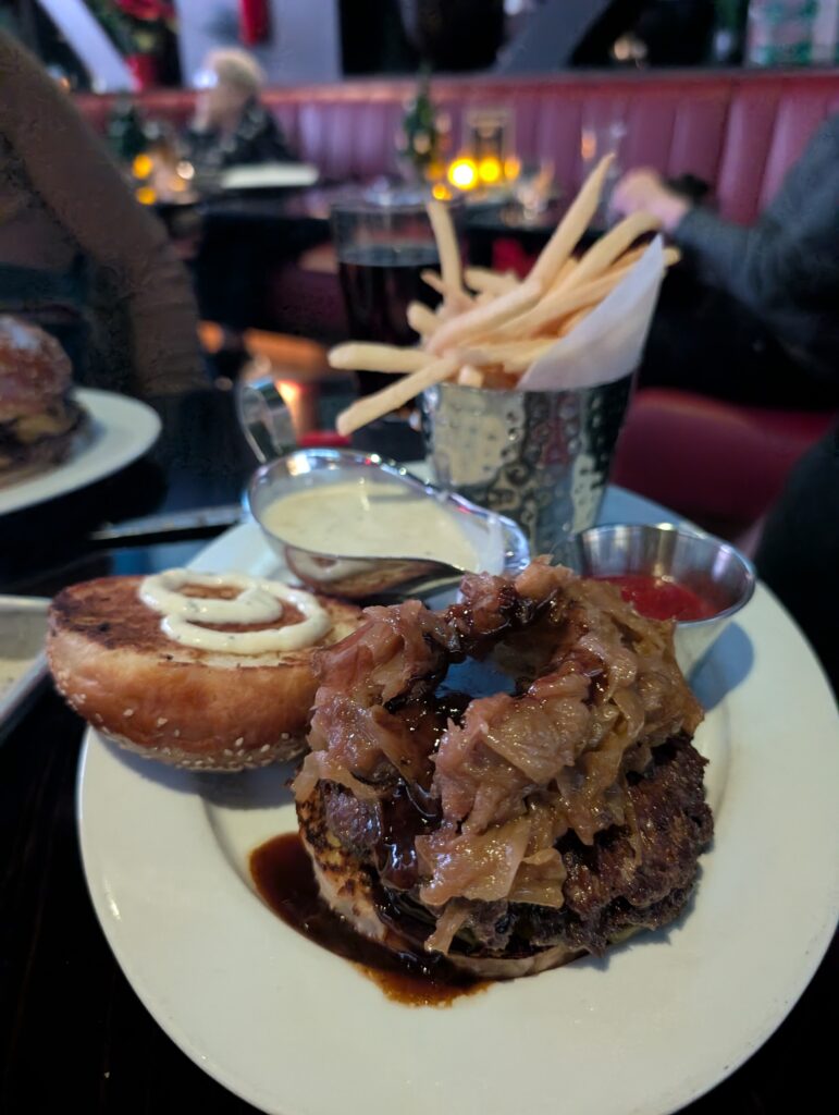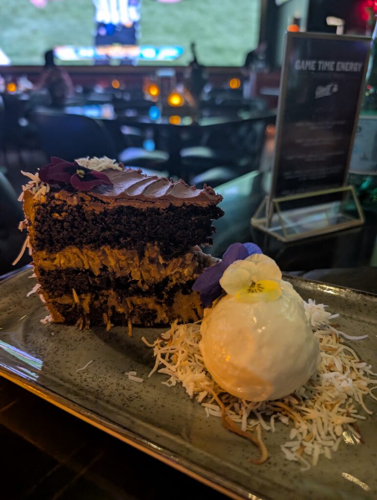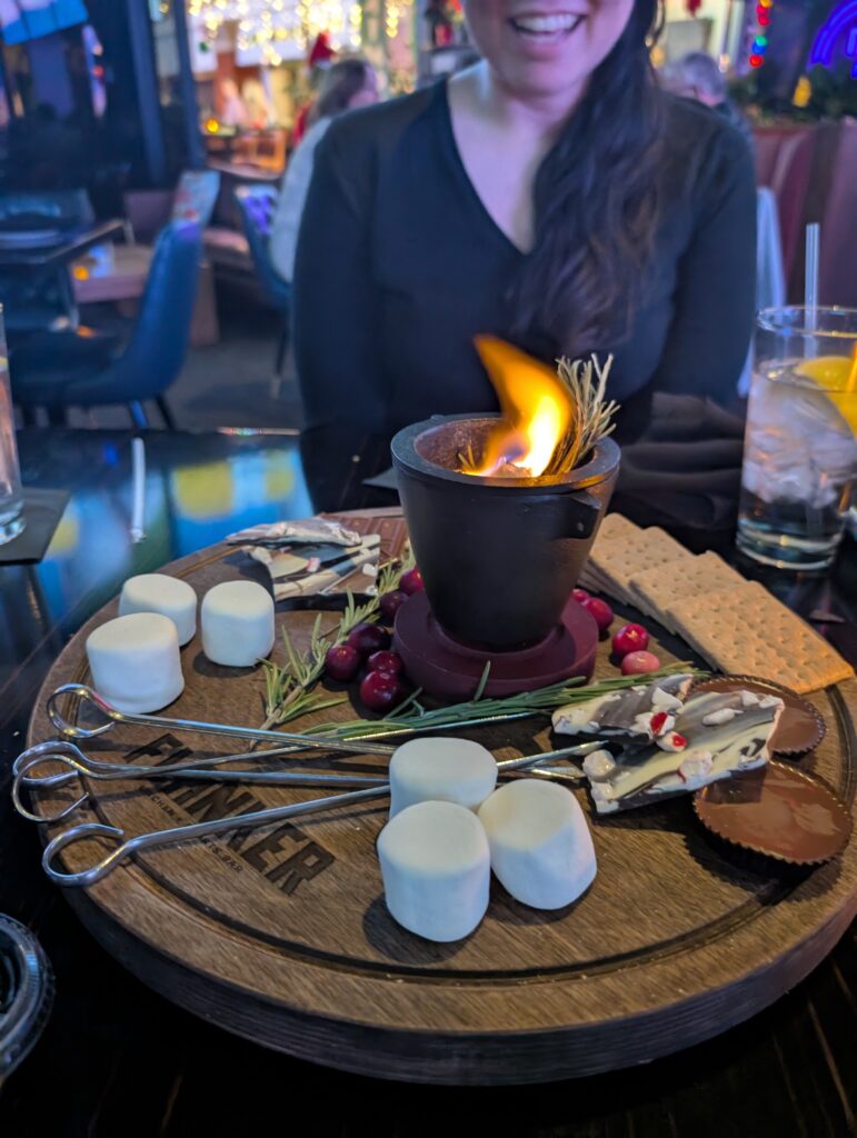 Desserts are upgraded as well. The German Chocolate Cake with layered coconut pecan filling served with coconut gelato is large enough to feed at least three. During the holiday season, a fun interactive offering is the Campfire S’Mores with graham crackers, peanut butter cups, chocolate, and marshmallows, which you toast over a small flame and compile yourself.