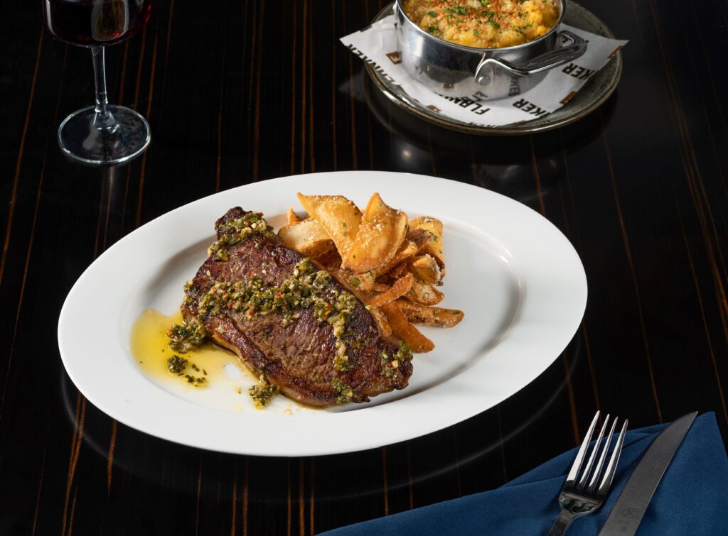Non-steak mains include Pastrami Spiced Wagyu Short Rib with shallot jam and roasted bone marrow, Roasted Duck Breast with red beet cream and red wine jus, and Big Eye Tuna ‘Foie-Poivre’—peppercorn-crusted tuna steak with roasted foie and peppercorn sauce.
