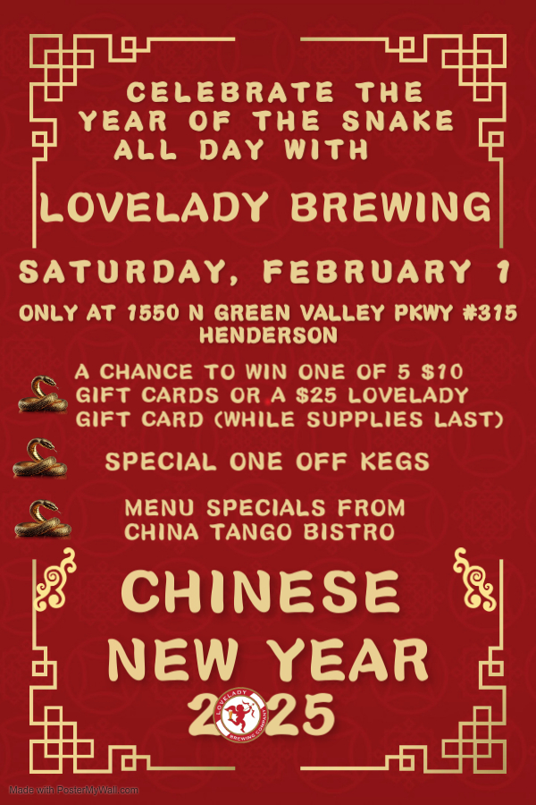Lovelady Brewing Company will help us celebrate the Chinese New Year of the Snake at its Green Valley taproom location at 1550 N Green Valley Parkway, suite 315. From noon to 11 p.m., there will be special one-off kegs pouring Yum Juice (Lovelady Love Juice Hazy IPA with yumberry) and Pink Radler (Lovelady Hefeweizen with pink lemonade), chances to win Lovelady gift cards, and menu specials from China Tango.