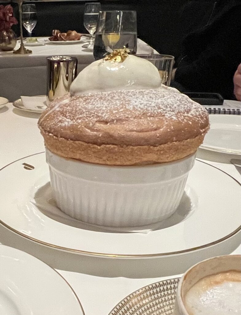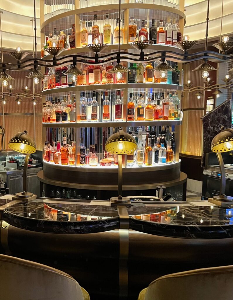 It’s a bit like going back in time, as the ambiance exudes old-school elegance, class and service, with three color-themed dining rooms (green, blue and red), a semi-circular bar displaying a plethora of fine whiskies, marble pillars, plush furnishings, white linen tablecloths, soft lighting, and tableside service of desserts such as Chocolate Mousse and Grand Marnier Souffle.