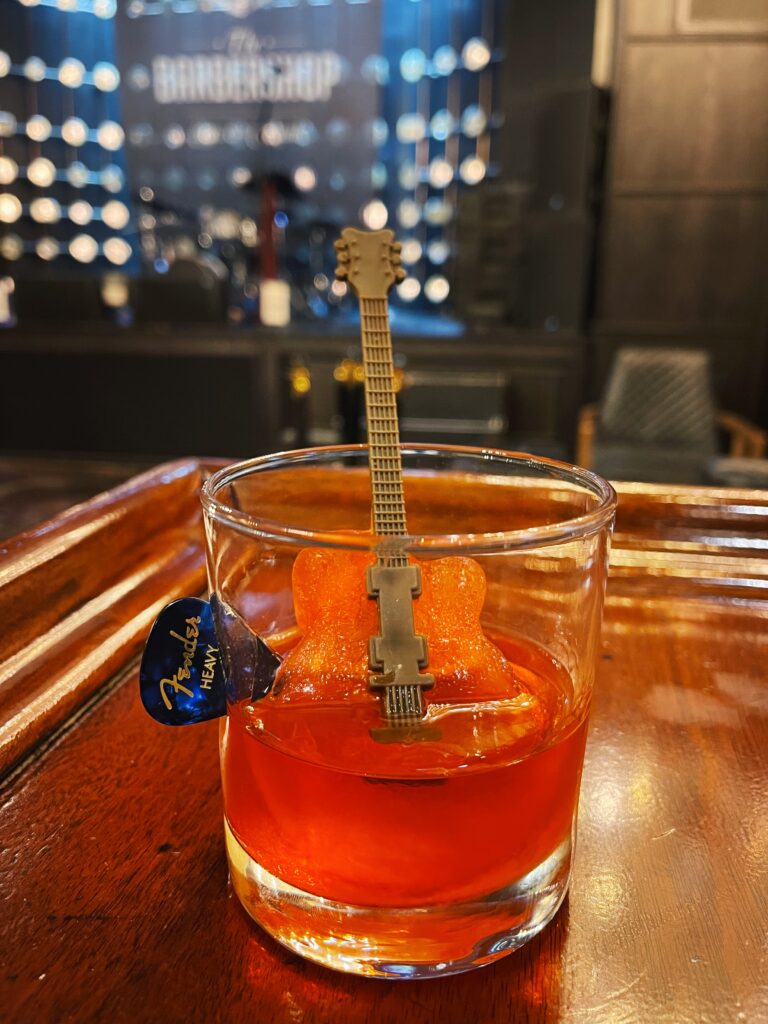 The Barbershop will also be serving two Japanese whisky cocktails made with Suntory Toki Japanese whisky: Danger, with Suntory Toki, Cointreau, and City Lights Cherry Lemon Shine; and Six String Sling, a twist on an Old Fashioned featuring Suntory Toki, Drambuie, and Angostura bitters served over flavored guitar-shaped ice in a glass with a commemorative guitar pick. Both cocktails are priced at $18.
