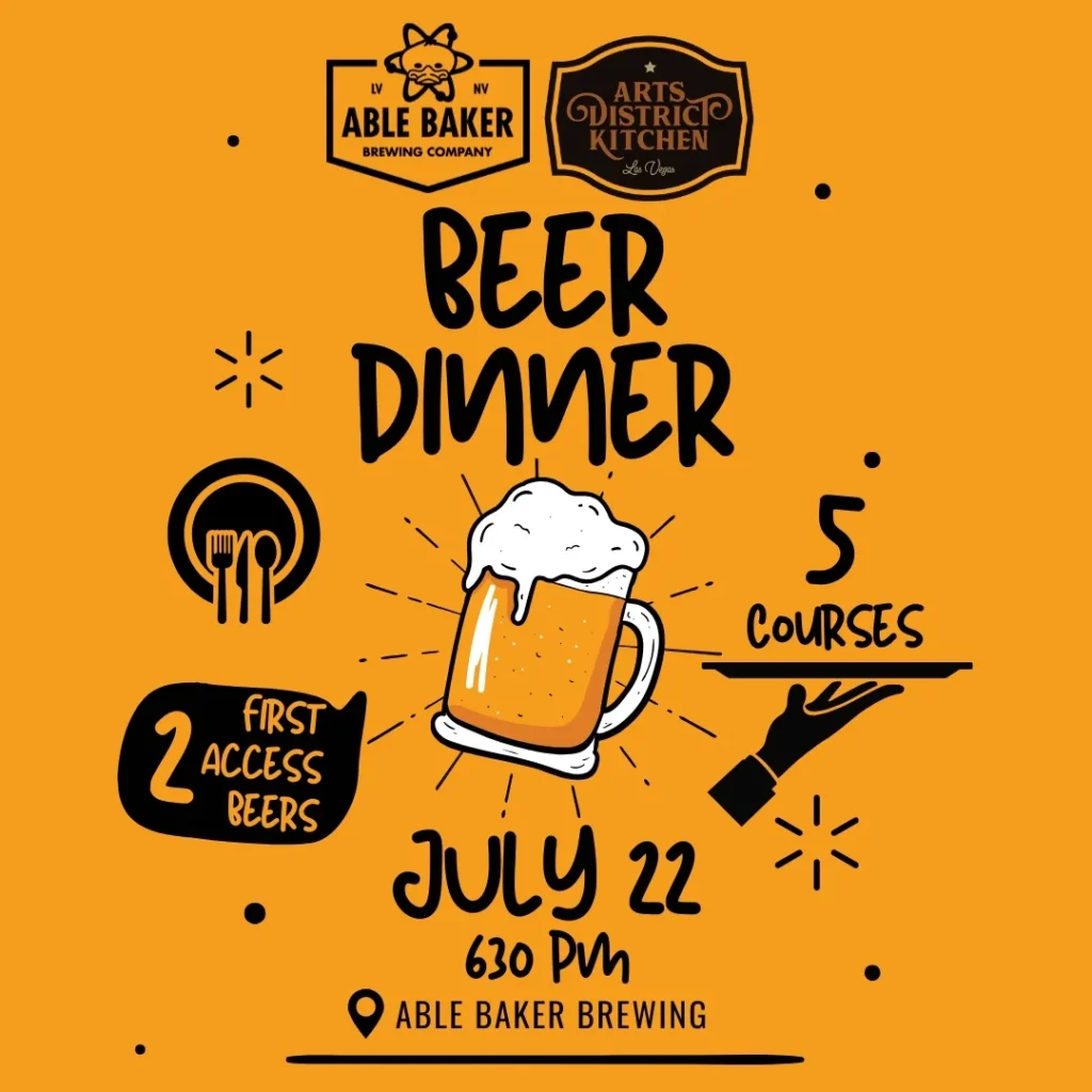 Able Baker Brewing will host its first beer dinner, pairing five of its beers with four courses, featuring special menu items from its Arts District Kitchen, specifically created for the occasion.