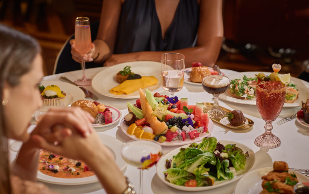 Served on Saturdays with seatings at 11 a.m. and 1:30 p.m., the three-course brunch menu starting at $150 per person (plus tax and tip) begins with seasonal fruit and artisanal pastries, followed by table-shared starters including Delilah’s Famous Chicken Tenders & Waffles with spicy maple syrup and Smoked Salmon with capers, tomatoes, shallots, and whipped cream cheese. Main course options include Prime NY Strip & Egg with scrambled eggs and breakfast potatoes; Delilah Benedict with serrano ham, poached egg, grilled asparagus, béarnaise, and breakfast potatoes; and King Crab Avocado Toast with cucumber, radish, sunflower seeds, and Green Goddess dressing. Several add-ons are available, such as Encore Plateau: king crab legs, Oishii shrimp, Maine lobster and West Coast oysters; The Only Caviar Service: Oscietra caviar, tiny waffles, whipped crème fraîche, eggs mimosa, shallots, and parsley; and Delilah’s Way: a bottle of 2015 Dom Pérignon Brut, Belvedere X, and caviar service.