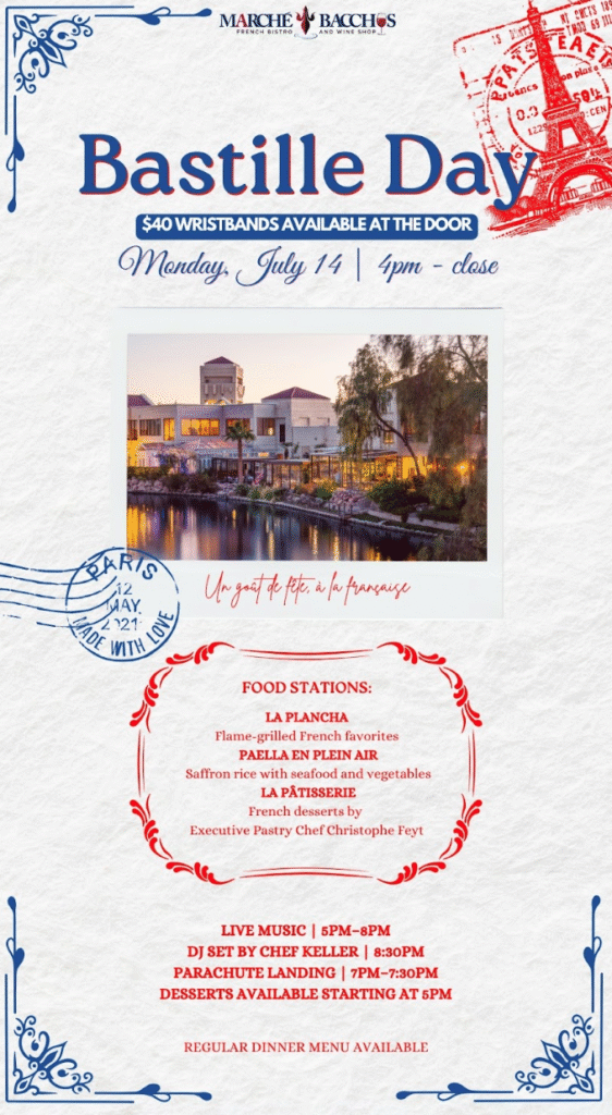 Marché Bacchus French Bistro & Wine Shop will celebrate Bastille Day with a lakeside evening of French food, music, and festive surprises from 4 p.m. to close.