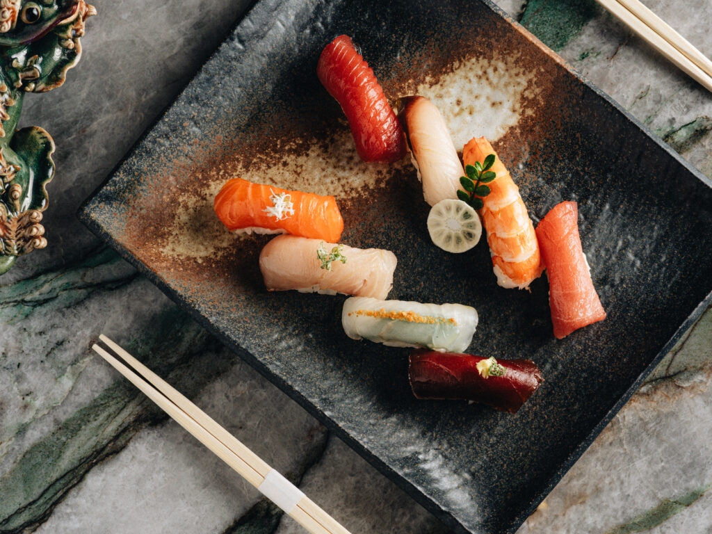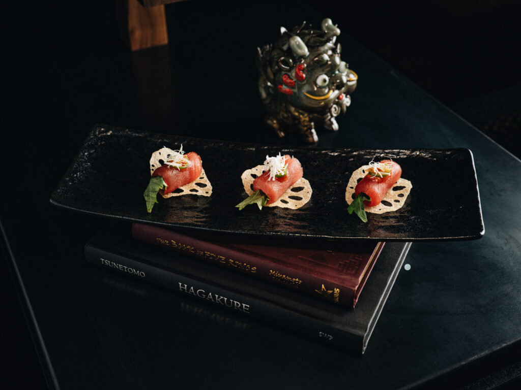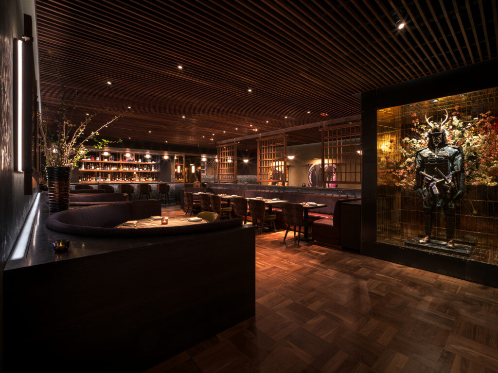 Nomikai is two concepts: a small bar out front allowing for a quick bite or drink, and just beyond a host stand and door with a button to push for admittance in true speakeasy fashion. Inside is an elevated 13-table speakeasy with additional bar seating and a classy room adorned with wall paintings of cranes and a geisha, a life-size samurai warrior statue, and rich wood slat ceiling and flooring creating an ambience that will make you forget you’re in a casino.
