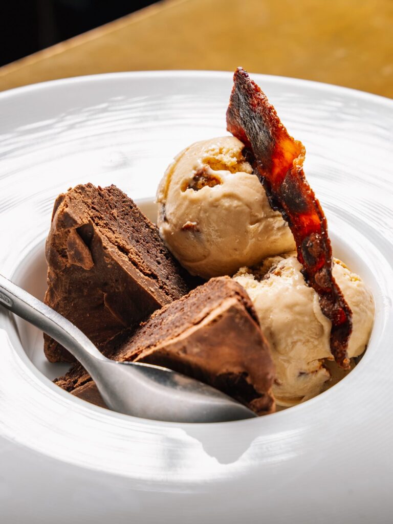 The Social Plates section of the menu is so named as the dishes are meant for sharing, like the Tempura Green Beans with pepper jelly cream cheese and “Devil’s” Eggs with crispy pancetta and caviar. The Secret Sunday Chicken, served with spicy pickle aioli, is Corey Harwell’s version of a Chick-Fil-A sandwich, which he was a fan of growing up in the South, so named because, unlike the chain favorite, you can get it here on a Sunday. Some truly unique offerings include the Cocoa-Espresso-Crusted NY Strip with red wine demi; Brussels Sprouts Caesar Salad, made with shredded Brussels sprouts, Parmesan, lardons, and bacon-fat croutons; and Bourbon Fudge Brownie with brown-butter bacon ice cream.