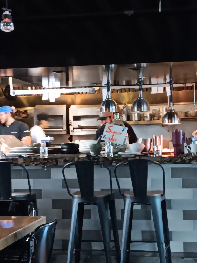 A long table fronting the open kitchen is a nod to Kerry Simon, as he had one like it in his home to entertain guests. Sitting in one of the six seats provides a bird ’s-eye view of the chefs in action. The table is also home to the Swear Jar, which you can add cash to, because, as General Manager Brendon Young explains, “The food is so good, it’ll make you swear.” Actually, once the glass container is full, Brendon breaks it open, and the spoils are divided among the line cooks and dishwashers.