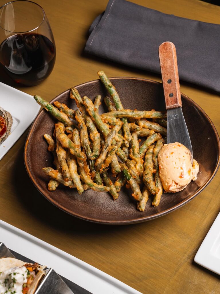 Some outstanding deals can be enjoyed during the weekday happy hour. Available exclusively in the bar area Monday-Friday from 3 to 5 p.m., they include Grilled Oysters ($3 each), “Devil’s” Eggs ($3 each), Gyro Tacos ($5), Tempura Green Beans ($6), select beers ($5), select wines by the glass ($8), and well drinks ($6).