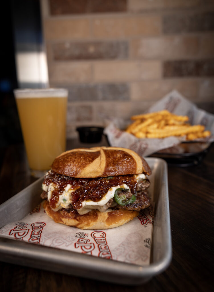 - Guinness Burger, a half-pound wagyu beef patty seasoned with pastrami spices topped with melted pepper jack cheese, Guinness bacon jam, and kosher pickles