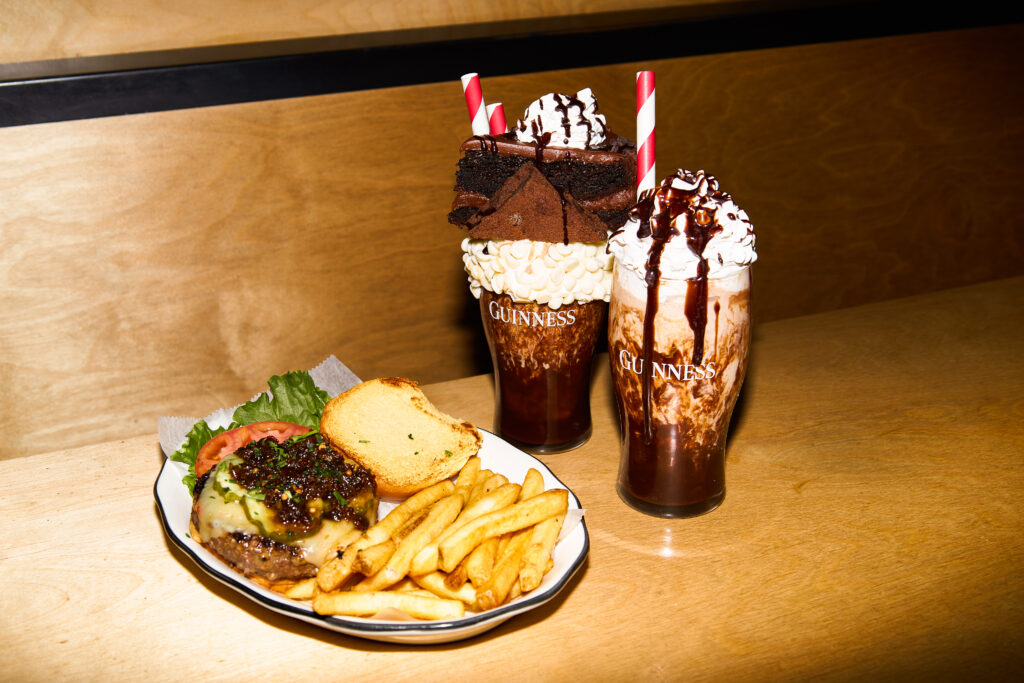- Guinness CrazyShake, a chocolate shake made with half a pint of Guinness Stout, served with a vanilla-frosted rim dipped in white chocolate chips and topped with a slice of Guinness chocolate cake, half of a brownie, whipped cream, and a chocolate drizzle