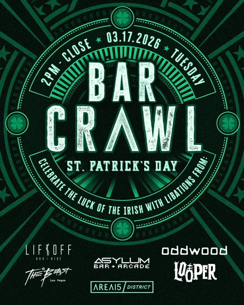 AREA15 will host a self-guided St. Patrick’s Day bar crawl across five of its drinking destinations: LIFTOFF Bar and Ride, Oddwood, The Beast, Asylum Bar + Arcade, and Looper Bar from 2 p.m. to close.