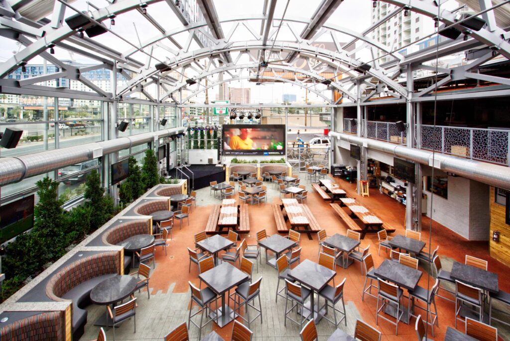 Guests can view every game aired from wall-to-wall TVs in the two-story indoor/outdoor venue, which features an 18-foot big-screen TV and 27 additional screens.