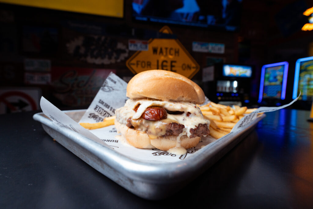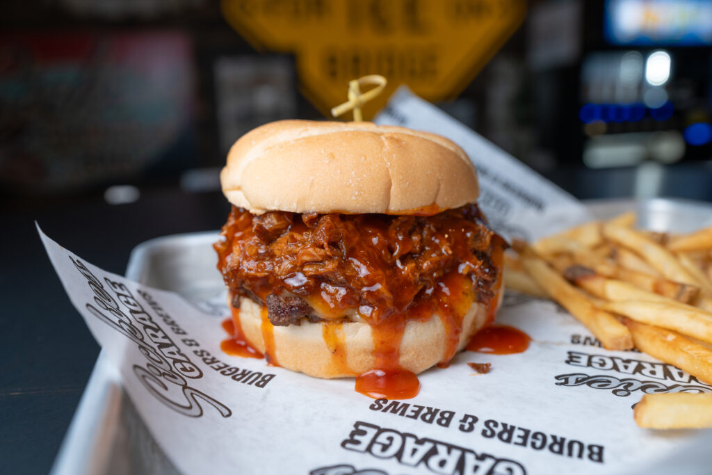 The garage theme, as well as the moniker, is derived from the founders’ practice of calling in sick to work on cars and eventually getting into making creatively insane burgers. The first location opened in Fargo, North Dakota, in 2012 and was followed by a dozen more in South Dakota, Kansas, Texas, Nebraska, and Florida, with the Las Vegas location at Town Square being its first and only venture out west.