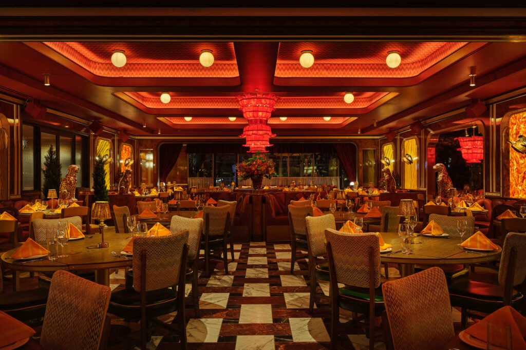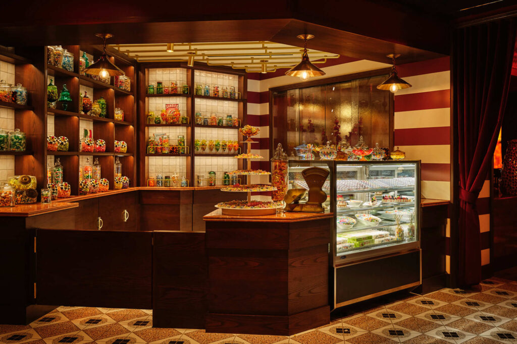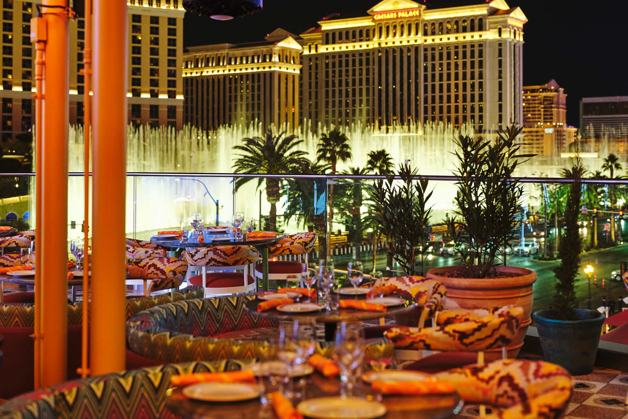 The decor is reminiscent of 1970s Italian glamour with a velvet vestibule, candy shop stacked with Italian treats, and a secret door to a moody hidden lounge dressed in ‘70s wallpaper and centered around a mirror mosaic DJ booth. The dining room is awash in opulent accoutrements like crystal chandeliers, rich caramel tones, life-sized cheetah statues, colorful tile flooring, and a patio terrace offering views of the Strip and Bellagio Fountains across the street.