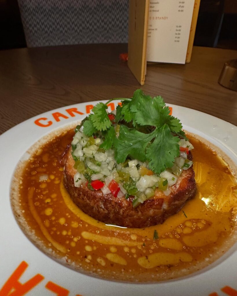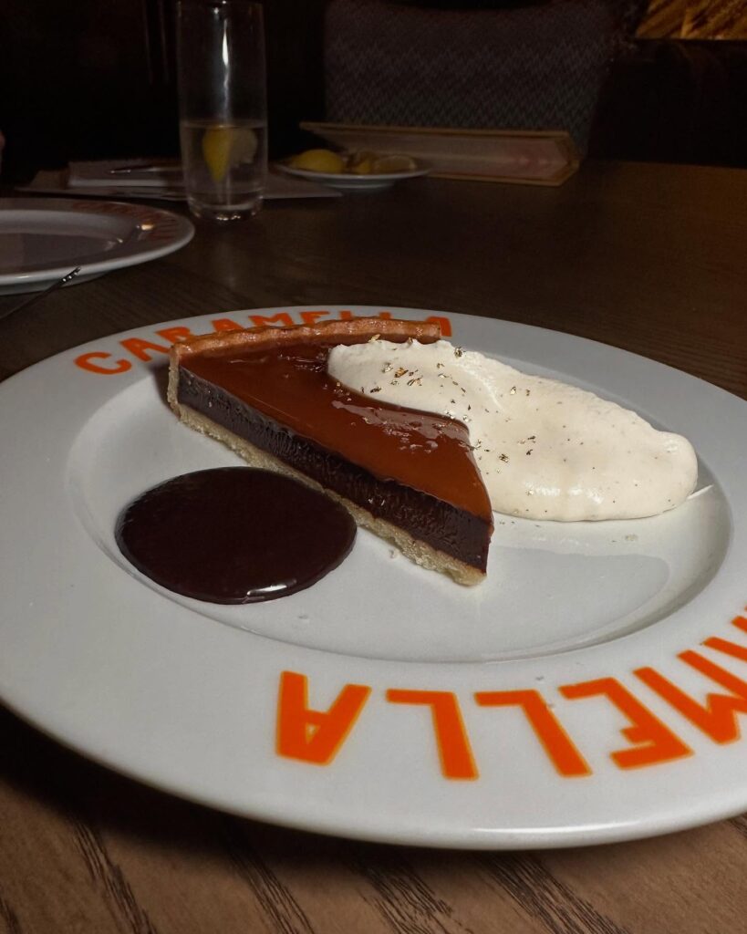 True to the restaurant’s name, the Signature Caramella Tart dessert features an almond crust, salted caramel, crème fraiche, dark chocolate custard, and gold flakes.