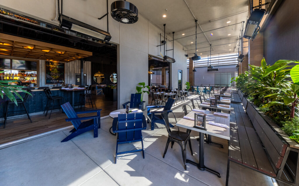 The décor features hardwood floor, wood lattice ceiling, hanging Edison lights, lots of greenery with a planter and shelves lined with potted plants, and the extensive whiskey collection on display above the bar. A very inviting feature is the patio with an open feel equipped with heaters, a fire pit, flowing water display, and fans with misters.