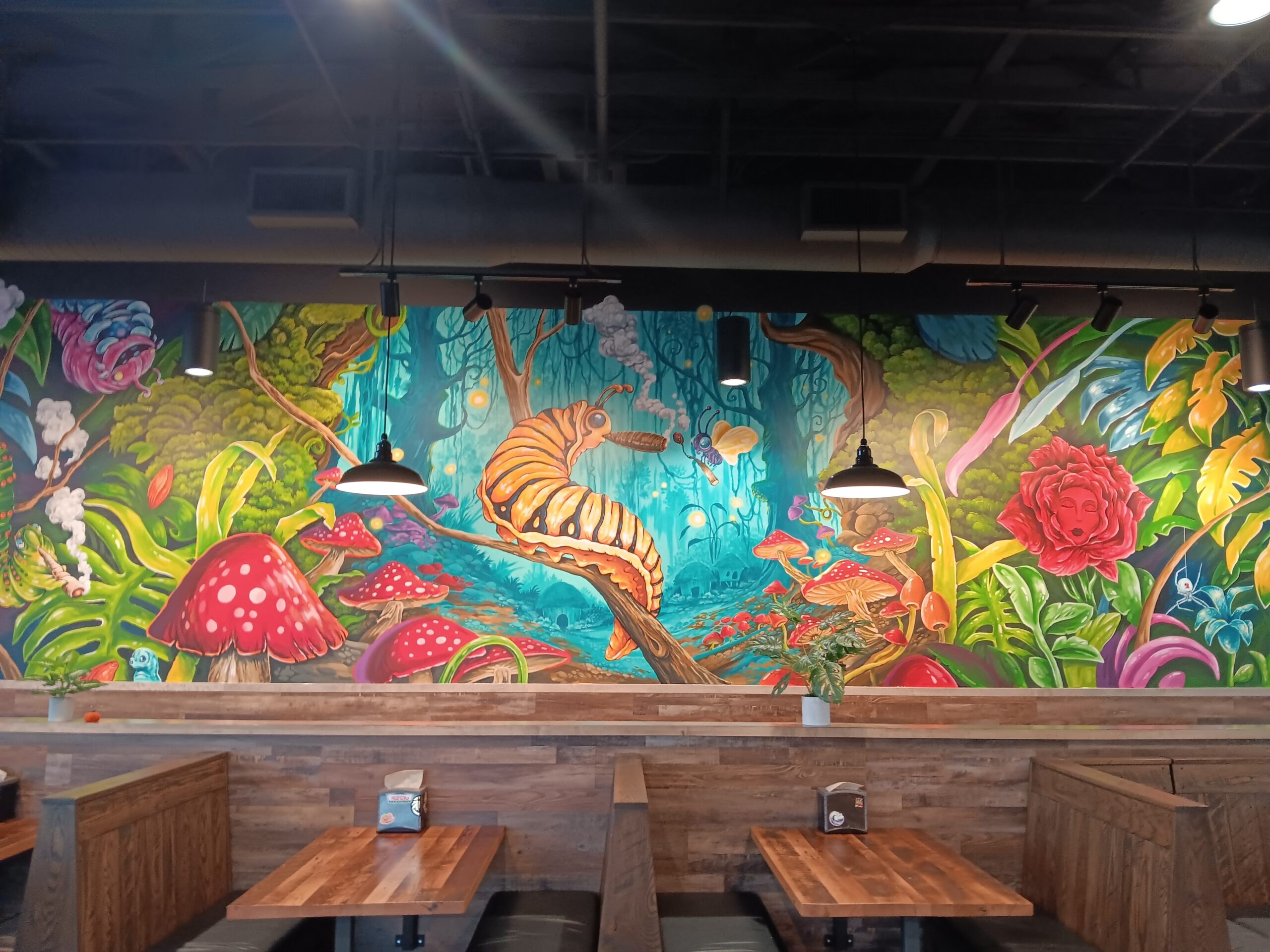 A stunning décor feature is the original artwork by acclaimed artist Joshua Finley covering the wall from the entrance to the ordering counter. With a botanical feel, the mural cleverly depicts caterpillars smoking blunts and a blooming rose, nodding to the Caterpillar equipment rental business next door and the street the sandwich shop is situated on. A full bar, with one side open to the outdoor heated patio, is also available.