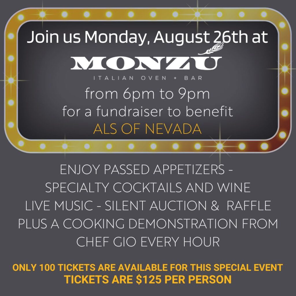 Tickets cost $125 plus a $4.53 transaction fee per person ($129.53 each) and can be purchased via GiveSmart, hosted by ALS Nevada. If you cannot attend but want to donate to the cause, you can do so via the same link. 100% of the proceeds go directly to the ALS Foundation.